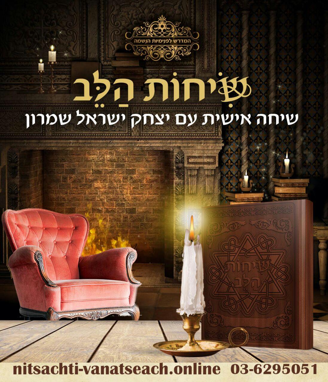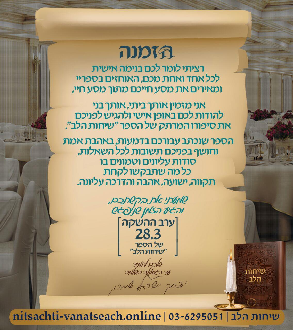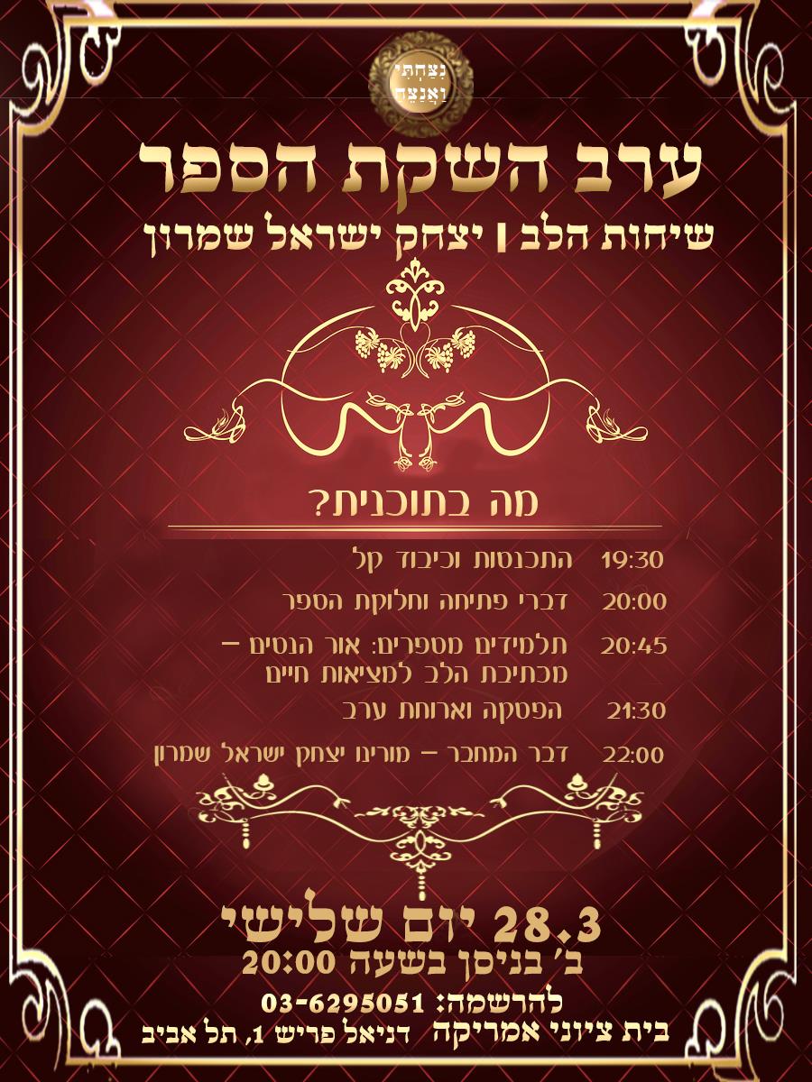 בשעה טובה ומבורכת, אנו שמחים ונרגשים לחגוג את השקת הספר המרתק "שיחות הלב", פרי עיטו של יצחק ישראל שמרון (מחבר "ניצחתי ואנצח"). היכוני לערב השקה מפואר, מוקפד, עשיר ויוצא דופן. בערב זה נחשוף את כל הסודות שנתגלו בחדר הקטן לאורך 16 שנה. עלות הכרטיס היא 150 ש"ח כולל מתנה מהודרת וכיבוד קל. השתתפות באירוע מותנית בהזמנת כרטיס - 03-6295051, 050-6592730 מחכים ומתרגשים להשתתפותך 🎬 אפשר לומר - זה ארוע של פעם בחיים!